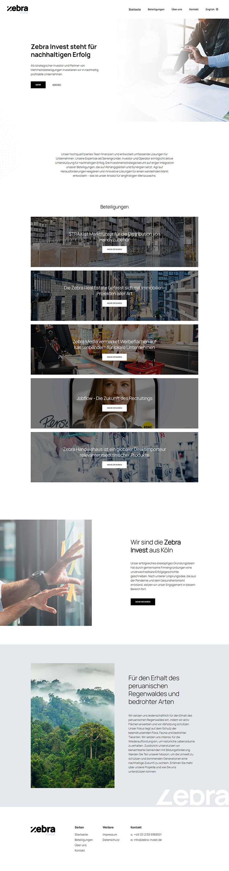 Zebra Invest ist ein strategischer Investor, der auf langfristigen, nachhaltigen Erfolg setzt. Mit dem Fokus auf Mehrheitsbeteiligungen investiert das Unternehmen gezielt in profitable Unternehmen, die nachhaltiges Wachstum anstreben. Zebra Invest versteht sich dabei nicht nur als Kapitalgeber, sondern als langfristiger Partner, der Unternehmen unterstützt, ihr volles Potenzial auszuschöpfen und gemeinsam eine erfolgreiche Zukunft zu gestalten. Nachhaltigkeit, sowohl im ökologischen als auch im wirtschaftlichen Sinne, steht im Zentrum der Investitionsstrategie, um einen dauerhaften Mehrwert für alle Beteiligten zu schaffen.